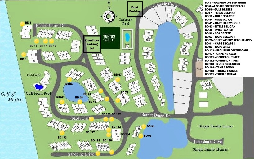 All of the Barrier Dunes townhouses are connected by a series of boardwalks that take you to two lighted tennis courts, private freshwater fishing ponds, two pools (1 direct beachfront & the 2nd HEATED in March, April, October & November), pet stations throughout, boat washing area, boat parking & a playground.